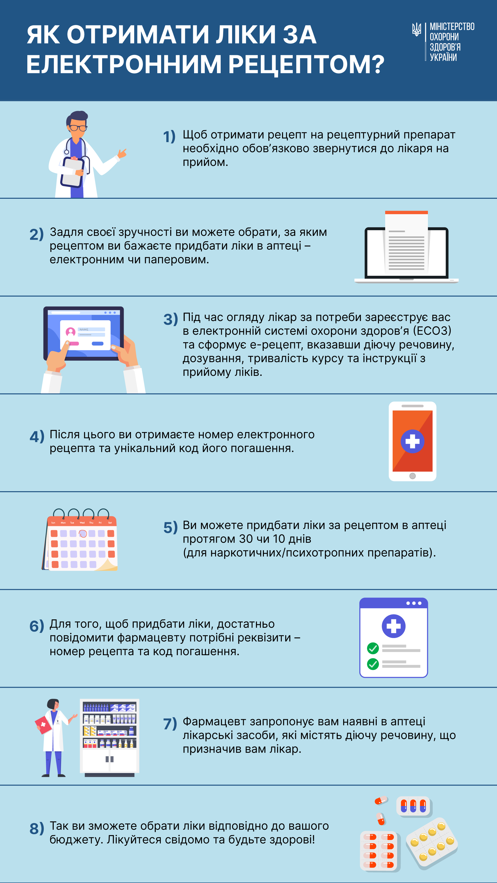 Під час огляду лікар за потреби зареєструє вас в електронній системі охорони здоровʼя (ЕСОЗ) та сформує е-рецепт, вказавши діючу речовину, дозування, тривалість курсу та інструкції з прийому ліків.